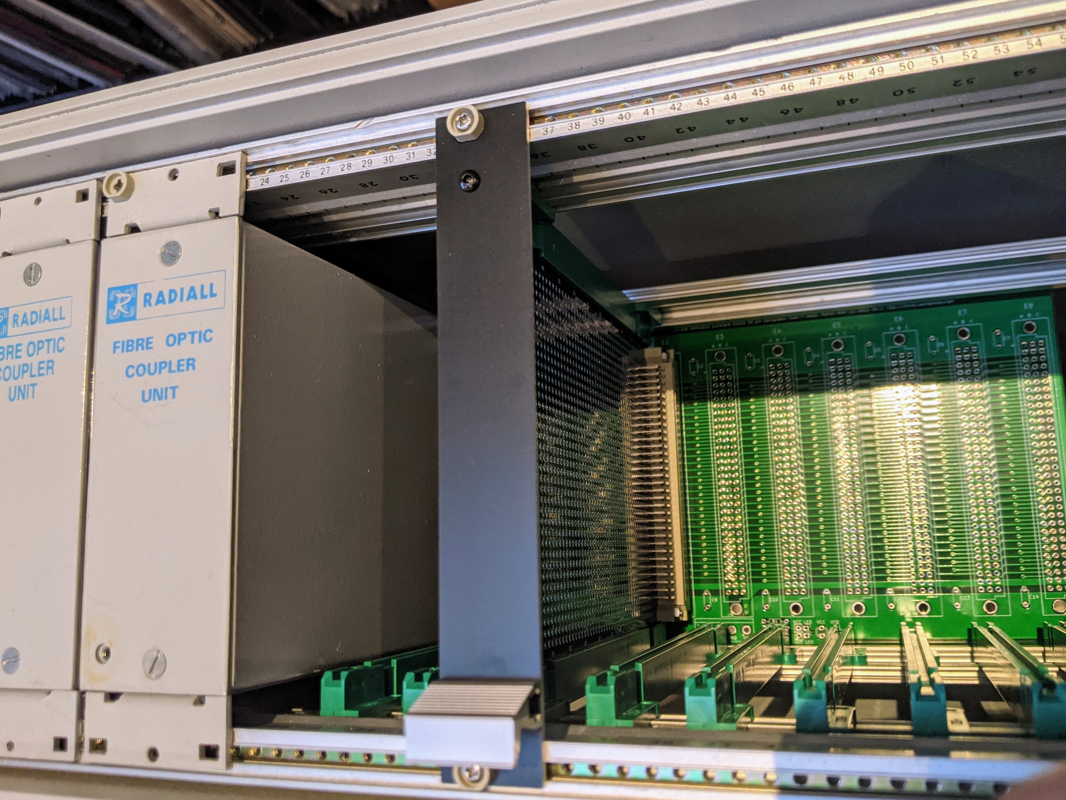 standard chassis sub-rack which, in turn, can be mounted in a 19-inch rack. The chassis consists of a series of slotted card guides on the top and bottom, into which the cards are slid so they stand on end, like books on a shelf. At the spine of each card is one or more connectors which plug into mating connectors on a backplane that closes the rear of the chassis.
