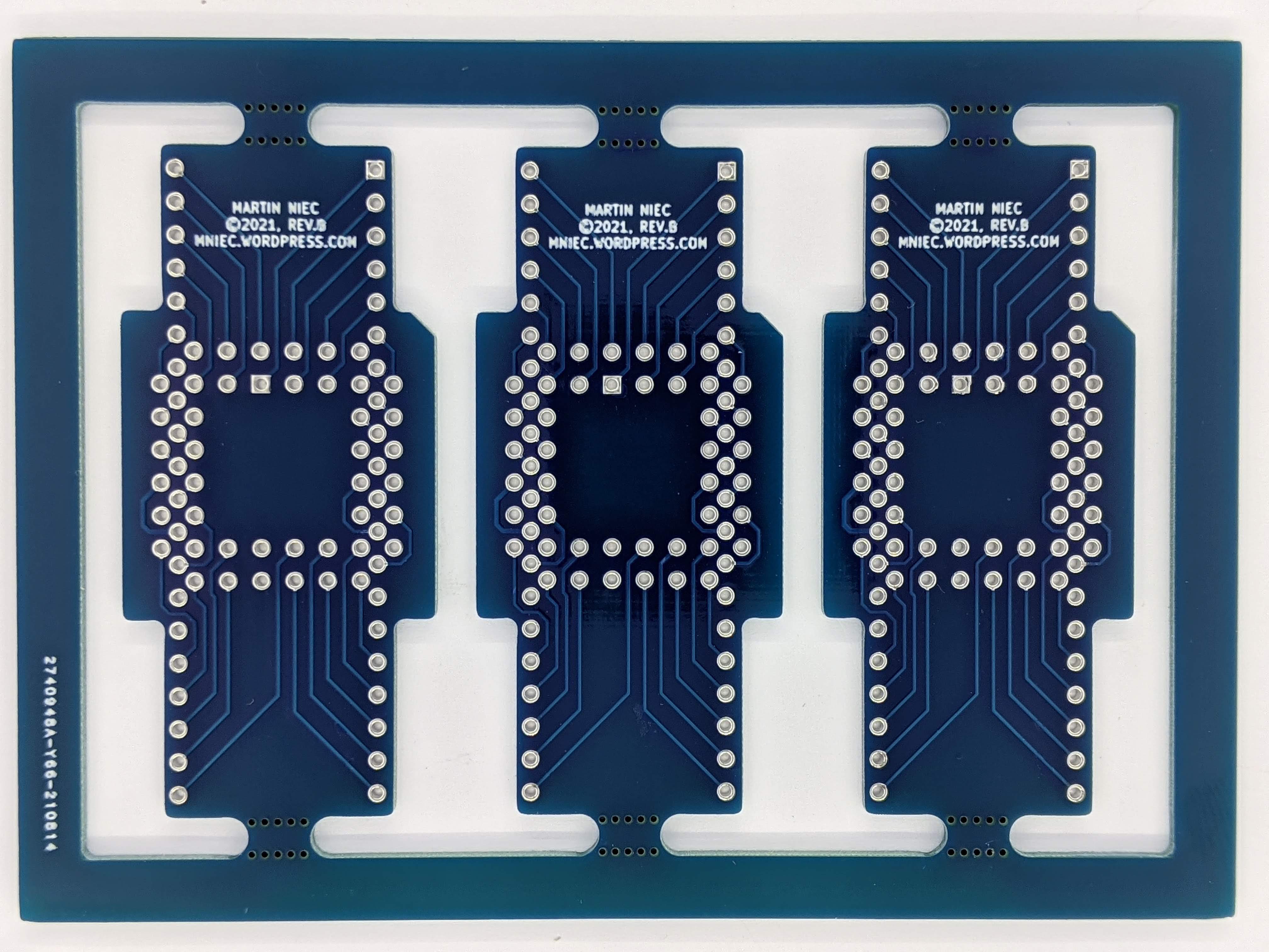 PCB was designed in a tenet that form follows function and nothing more. Nothing special to mention about PLCC44 footprint, throughole package was chosed as it's easier to solder at home and pins don't colide. Machined DIP headers are strongly recommended as classic might ruin your precious DIP socket.