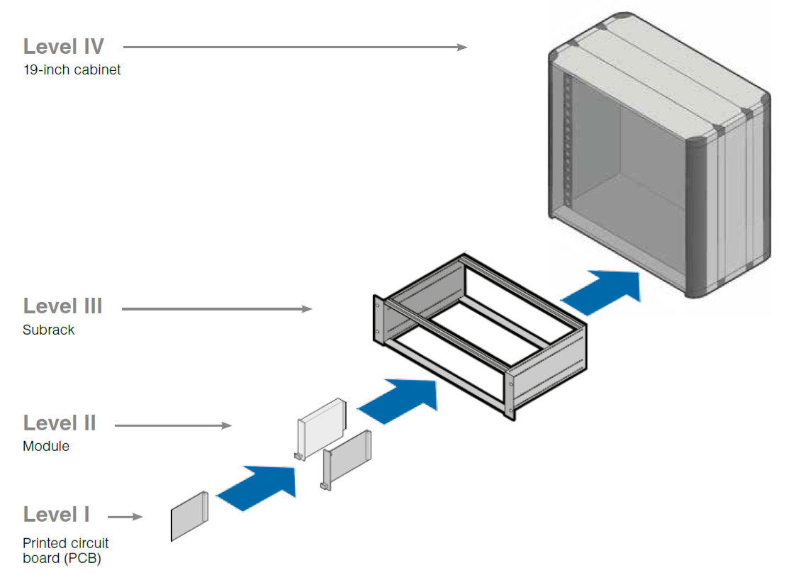 standard chassis sub-rack which, in turn, can be mounted in a 19-inch rack. The chassis consists of a series of slotted card guides on the top and bottom, into which the cards are slid so they stand on end, like books on a shelf. At the spine of each card is one or more connectors which plug into mating connectors on a backplane that closes the rear of the chassis.