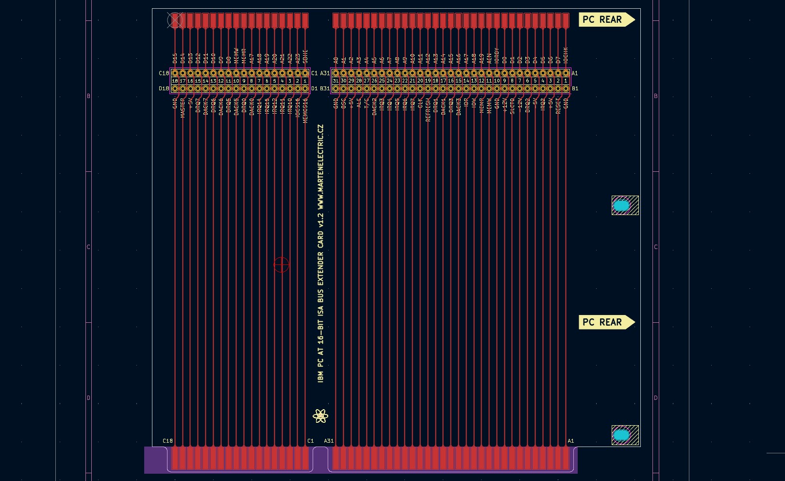 PCB footprint (from v1.0) accomodates holes for installation of rear PC case bracket. PCB sports standard 2x49pin PCB edge connectors with 45° chamfered edge for easy insertion and comes with industry standard 98pin (2x31 + 2x18 pin) ISA Bus edge connector.