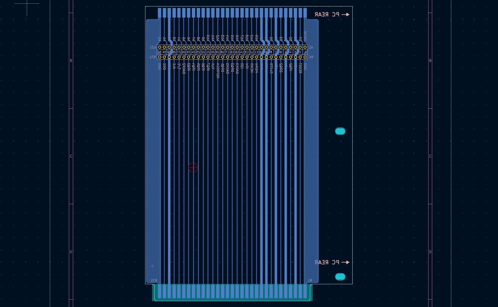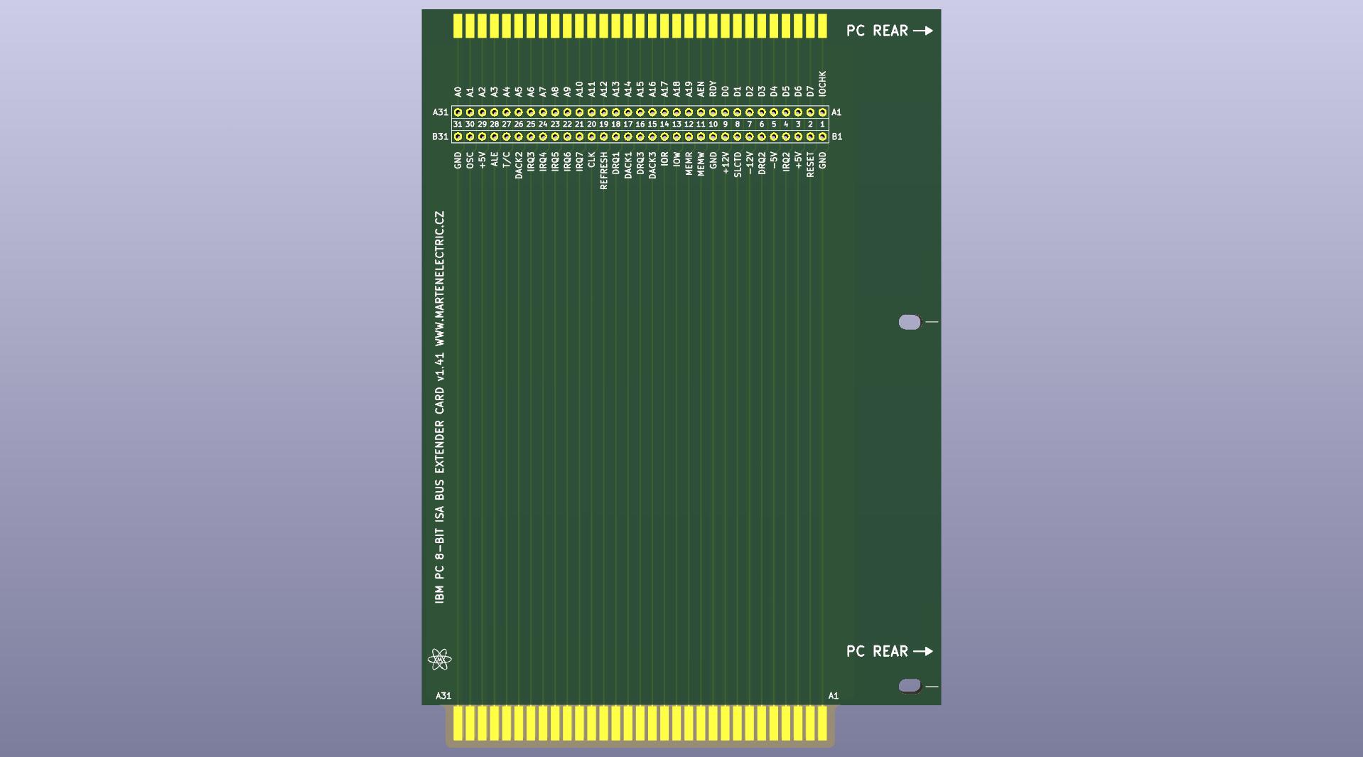 PCB footprint (from v1.3) accomodates holes for installation of rear PC case bracket. PCB sports standard 2x31pin connectors with 45° chamfered edge for easy insertion and comes with industry standard 62pin (2x31 pin) ISA Bus edge connector.
