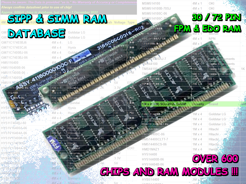 Welcome to my 600ish database of chips used in vintage 72 and 30 pin RAM modules. Most likely the most comprehensive database on internet :)