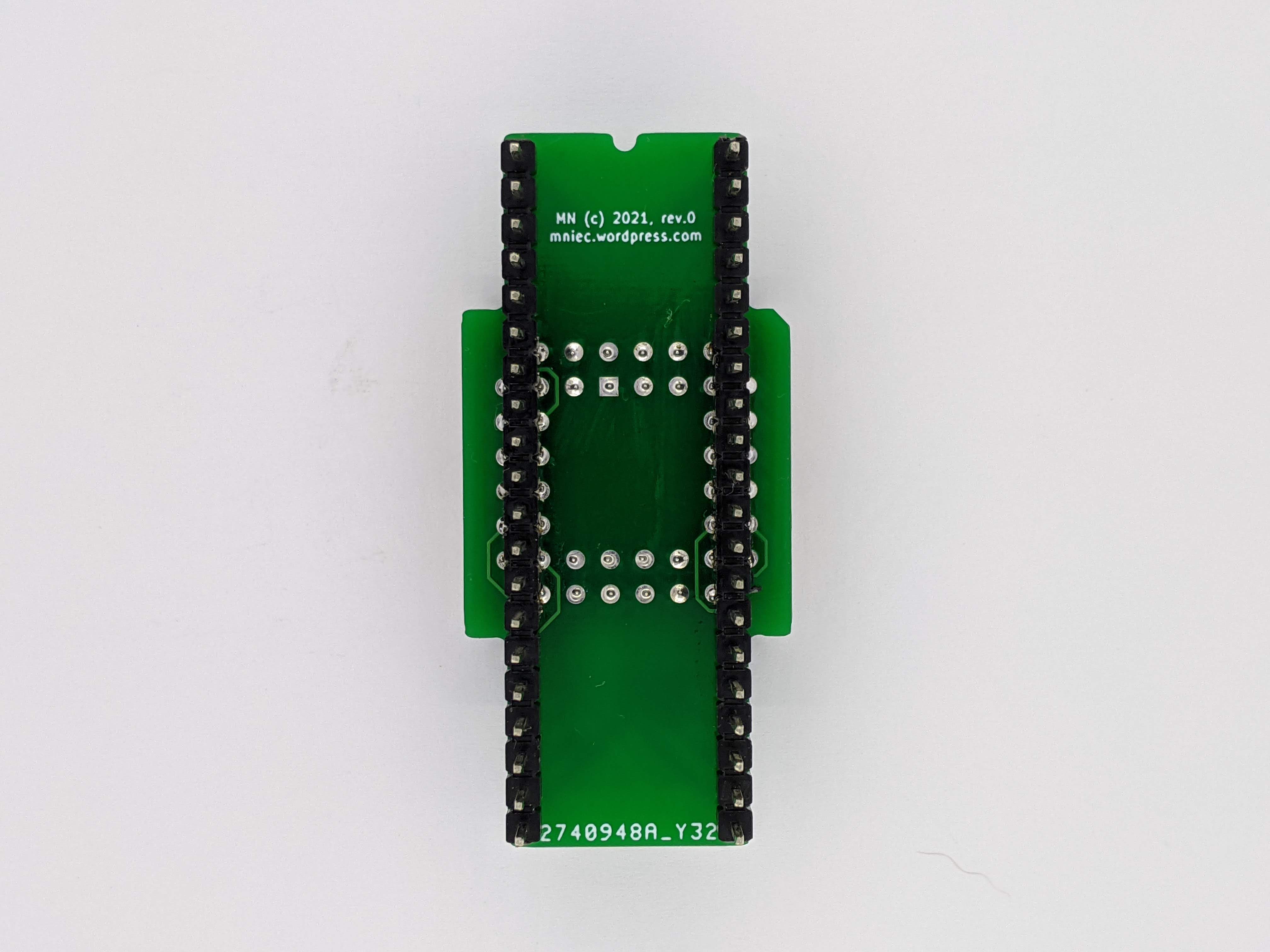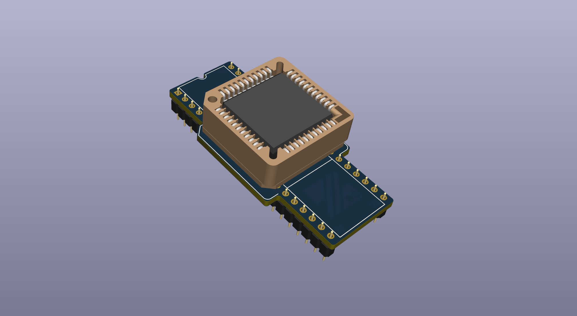 PCB was designed in a tenet that form follows function and nothing more. Nothing special to mention about PLCC44 footprint, throughole package was chosed as it's easier to solder at home and pins don't colide. Machined DIP headers are strongly recommended as classic might ruin your precious DIP socket.