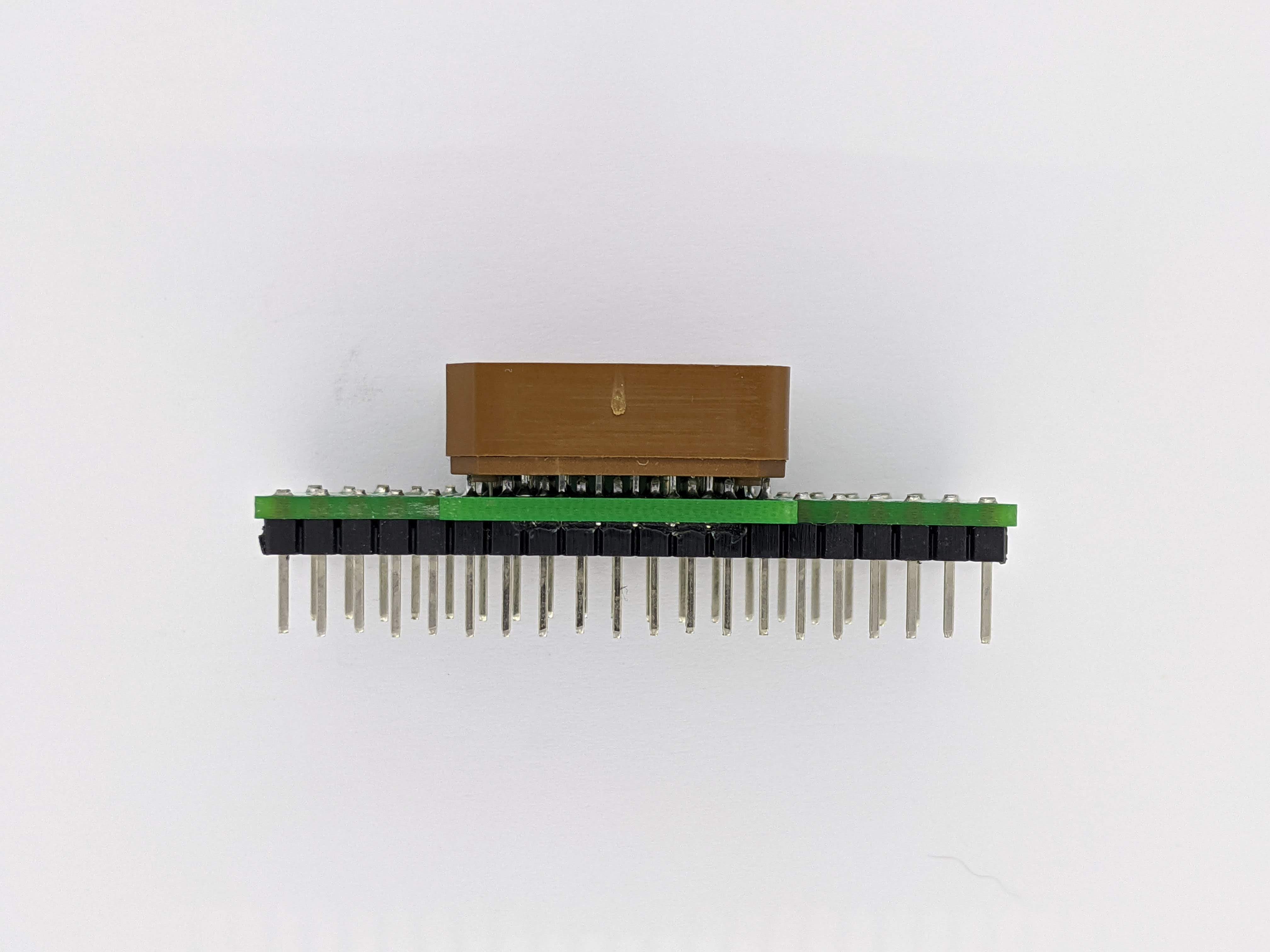 1 - First start with pin headers: Insert and solder 2x Pin header, Vertical, 1x20 THT to bottom side of PCB. Pin headers are in 600mil pitch spacing. Use quality MACHINED golden plated pin headers, they are cheap and will protect your precious DIP socket.